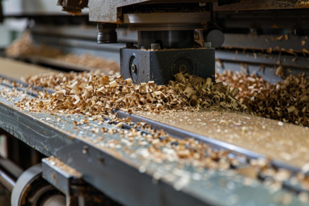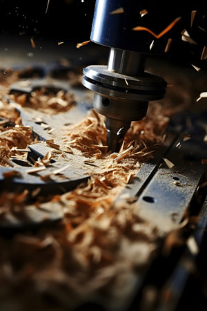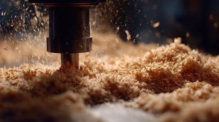 This dynamic image captures the intricate process of metalworking, showcasing the precise action of a CNC machine slicing through wood, creating fine shavings that float gracefully through the air.