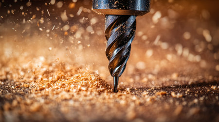A high-speed drill bit is cutting into a wooden surface, creating sparks and shavings that fly in all directions, capturing the essence of craftsmanship.