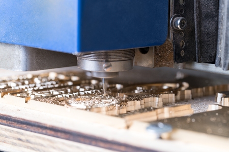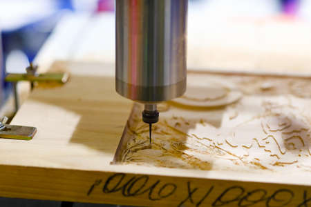 Close-up shot of machine with numerical control cuts wood. Cnc tool.