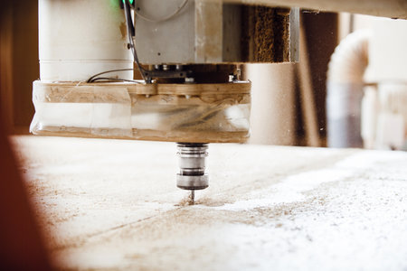 Cnc machine at carpentry workshop. Cutting wood with various router bits.
