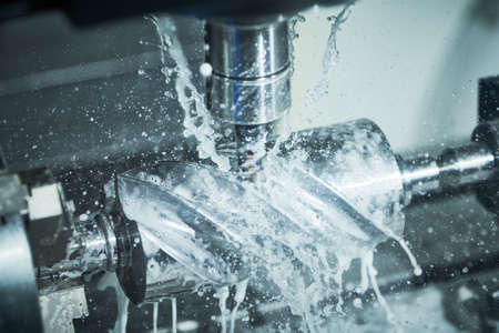 Milling process. Industrial CNC metal machining by vertical mill. Coolant