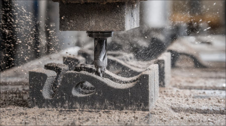 Captured in a workshop, this image showcases a CNC milling machine in action, producing metal shavings and fine dust, highlighting precision engineering.