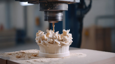 A precision CNC machine intricately carves frosting decoration on a cake in a contemporary workshop, showcasing advanced techniques and creativity.
