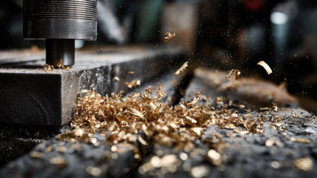A dynamic close-up image showcasing metal shavings and wood chips resting on a workshop surface, reflecting the precision of industrial cutting processes.