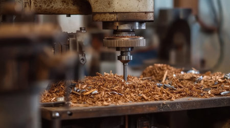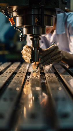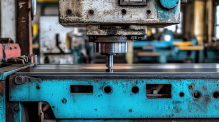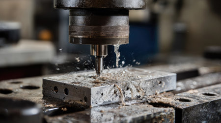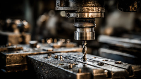 A close-up view of industrial machinery featuring a metal drill bit poised for precision work on steel materials. The workshop scene highlights craftsmanship and engineering.