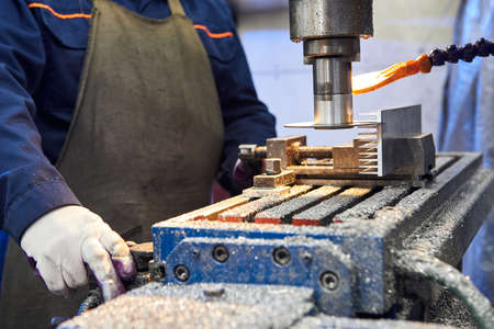 Professional machinist hand working with milling machine in metalworking factory, lathe metalworking industry concept