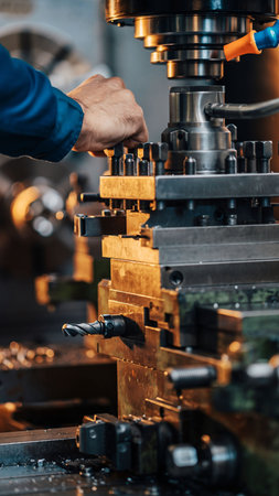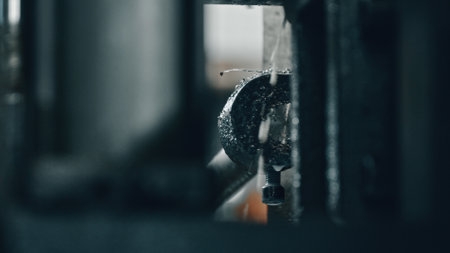 Detailed view of industrial machinery in action, showcasing precision tools and metal surfaces in a workshop environment. Ideal for engineering and manufacturing themes.