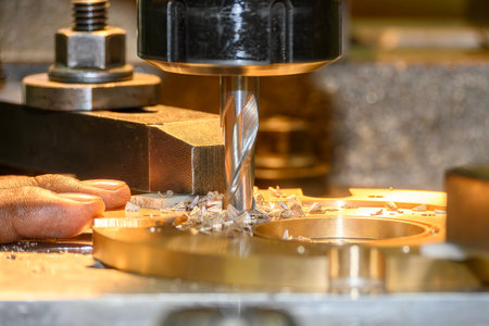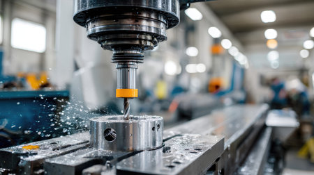 A close-up view of precision drilling in a manufacturing facility, showcasing a drill bit creating metal shavings in a high-tech environment.