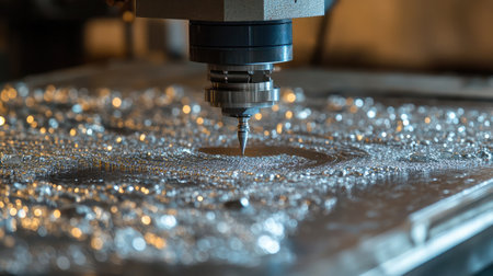 This image captures a close-up view of a CNC milling machine in action, highlighting precision metal cutting and the intricacies involved in modern manufacturing.