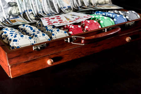 a grand casino super prize - a case full of chips, dollars and playing cards on a black background