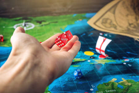 Hand throwing red dice on the world map of the playing field handmade Board games with a pirate ship. The game of battleship.