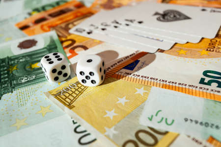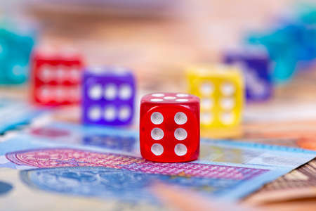 colorful dice close-up on a background of euro banknotes, business opportunity and risk concept