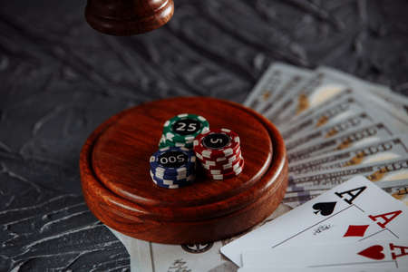 Online gambling and justice theme, cards and judge gavel on old grey table.