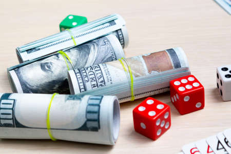 Gambling for money. Black dice and dollars on a wooden table.