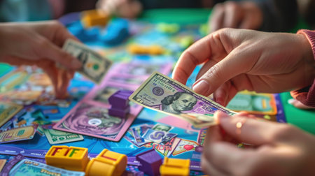 Group of people playing financial board game in cozy indoor setting.