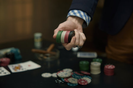 Male hand holding poker chips above the game table