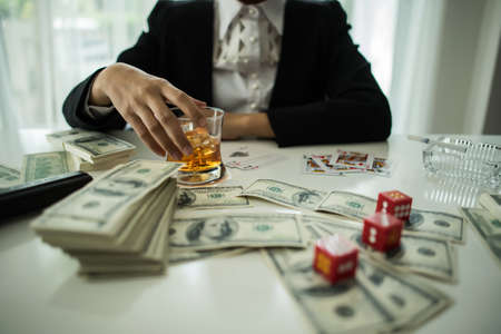 Businessman sitting in a business center bar smoking cigar and drinking whiskey and money on the table.