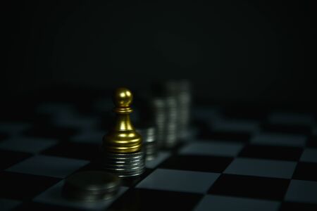 Many heap of coins on chessboard game with rival team, business strategy, financial plan and investment concept