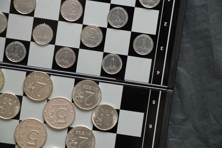 Ukrainian hryvnia and Russian rubles lie on a chessboard, sanctions in Russia, finance and economics