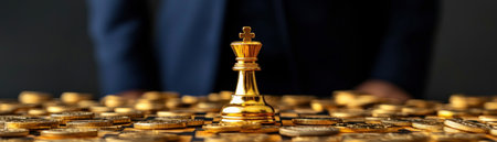 Golden chess piece among coins symbolizing strategic success.