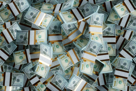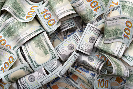 US dollar banknotes as background. One hundred dollar bills spread out. Fifty and 100 USD paper bills