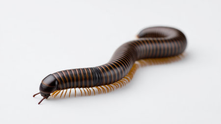 A detailed close-up image of a brown millipede showcasing its vibrant orange ridges and smooth body against a clean white backdrop, perfect for educational use.