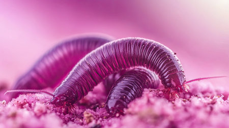 This striking macro photograph captures vibrant purple millipedes against a soft pink background, showcasing their intricate details and textures.