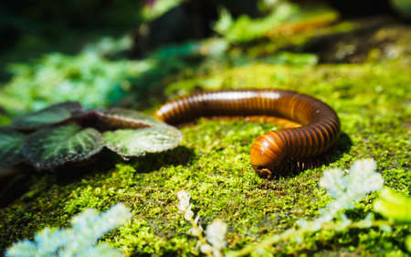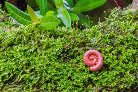 image of Tropical spiral many legs insect(millipede) on green moss.