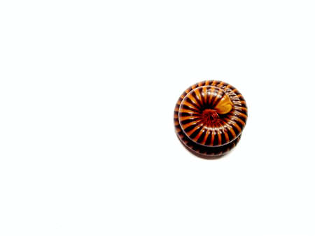 Close-up macro photo of a banded millipede curled in a spiral