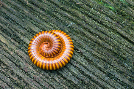 Curved millipedes curled up on artificial wood in the summer.