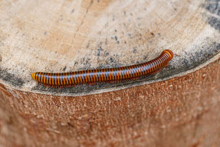 Close up view of a millipede on timber cut texture