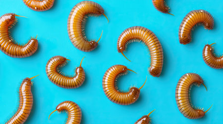 This high-quality image showcases vibrant millipedes with a shiny texture, set against a bright turquoise background. Ideal for educational or artistic use.