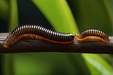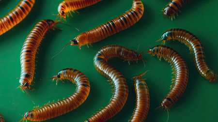 This striking macro image showcases colorful centipedes on a vivid green background, highlighting their unique anatomy and natural beauty in detail.