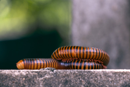 A millipede. Millipede walk on stone floor background. Centipedes, ants swarmed by a large bite on the gray stone