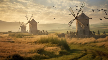Generative AI : Old traditional tower mill in La Mancha Spain