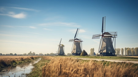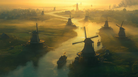 Experience a breathtaking sunrise over picturesque Dutch windmills surrounded by serene waterways and misty landscapes, capturing the beauty of nature.