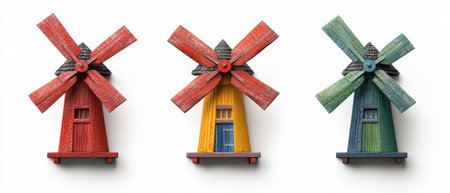 Colorful garden windmill set isolated on white background; perfect for decorative mockups and whimsical design. Studio lighting, high-quality 4K.