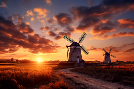 An old mill you have a picturesque beautiful field against the backdrop of the setting sun