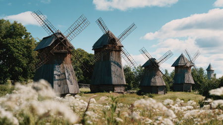 Angla, Saare County, Estonia-09AUG2024-Angla Windmills and Heritage Center in Saaremaa, Estonia. Old wood flour windmills in summer.