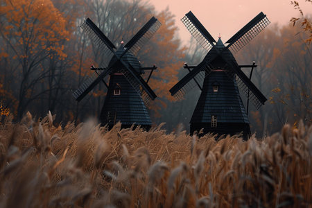 A tranquil landscape showcases several windmills positioned along a serene body of water. The scene is bathed in the soft hues of dawn. The composition offers reflections and contrasts in color, with opportunities for usage in editorial, advertising, and design projects. The photograph conveys peace.