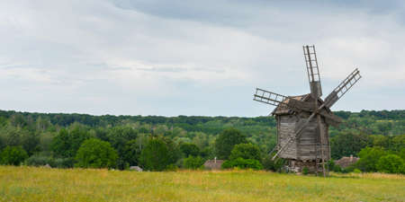 Old abandoed ruined ukrainian wooden mill of the nineteenth century, summer landscape