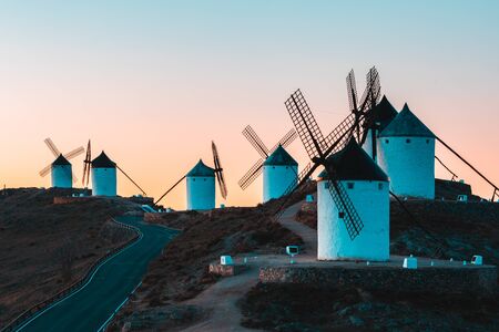 Windmills silhouette in Consuegra, Spain, at sunrise - Beautiful view of old windmills in the Castilla La Mancha region, Spanish countryside - Travel and architecture concept, teal and orange filter