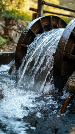 An antique water wheel stands near a cascading stream in a verdant setting. The image features a rustic structure with weathered wood and stone steps. The overall composition shows natural light, capturing textures in the water and surrounding foliage, suitable for environmental or historical themes. The scene could be used for various media purposes.