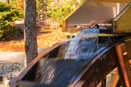 Water wheel in the green park. Watermill in the park.