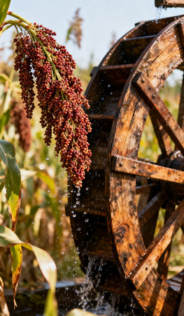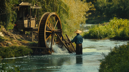 A traditional wooden waterwheel turning in a peaceful river, surrounded by lush greenery.