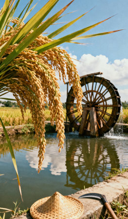 Rice plant with a water wheel in the background, Thailand.