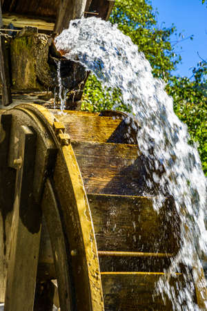 Working watermill wheel with falling water in the village.