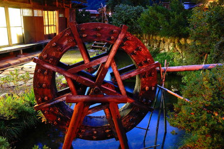 Japanese old house wall and water mill.