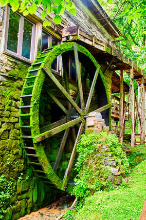 Watermill Water wheel on stream vertical covered in green moss