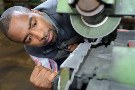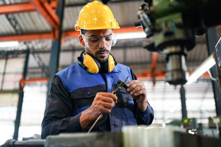 African men mechanical engineer, wearing safety equipment. While doing machine maintenance and safety control while work inside of factory area. With blurred background of heavy machine.